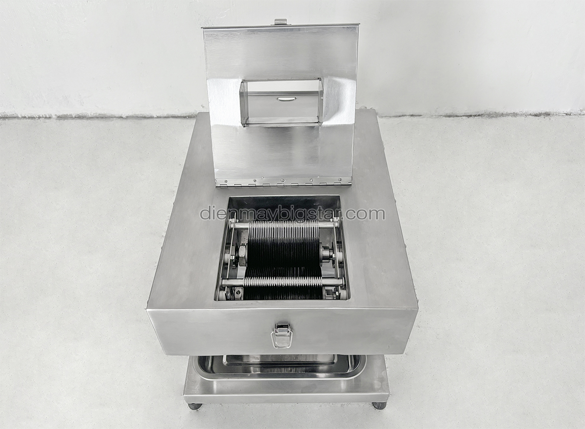 Máy được trang bị 80 lưỡi dao thép không gỉ, sắc bén, sắp xếp cố định. Mỗi lần cắt cho ra khoảng 40 lát thịt đều, đẹp, không bị nát. Lưỡi dao có độ bền trung bình từ 3-4 năm và dễ dàng thay thế hoặc vệ sinh.