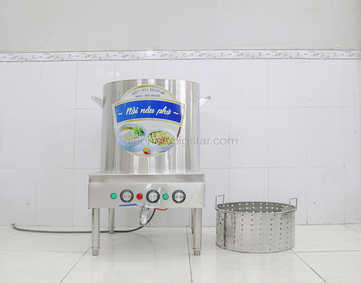 Nồi nấu phở bằng điện 100L là một thiết bị bếp được lắp đặt phổ biến nhất tại các nhà hàng, quán phở và các bếp ăn công nghiệp. Nồi nấu phở 100L không chỉ giúp người đầu bếp tiết kiệm thời gian nấu mà còn mang lại những hiệu quả vượt trội cho công việc nấu nướng. Khu bếp nấu chuyên nghiệp hơn, sạch sẽ, vệ sinh an toàn thực phẩm cũng được nâng cao hơn. Đun nấu hoàn toàn tự động, không khói và bụi tro.