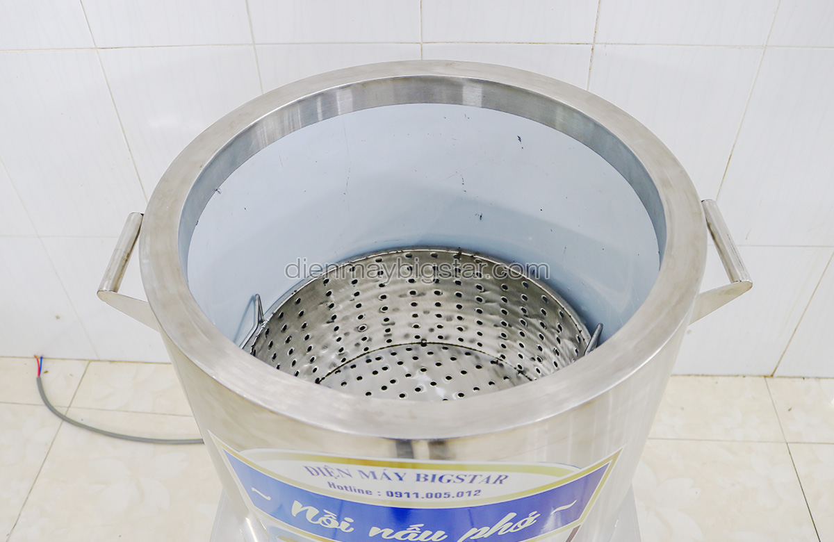 Nồi nấu phở, nồi hầm xương 100l được thiết kế với giỏ đựng xương. Chất liệu giỏ xương làm từ Inox 304 đảm bảo vệ sinh ATTP. Trên giỏ xương có những lỗ nhỏ để tránh vụn xương khi hầm không bị rơi ra ngoài. Khi ninh xong chỉ việc nhấc giỏ xương để ra ngoài.